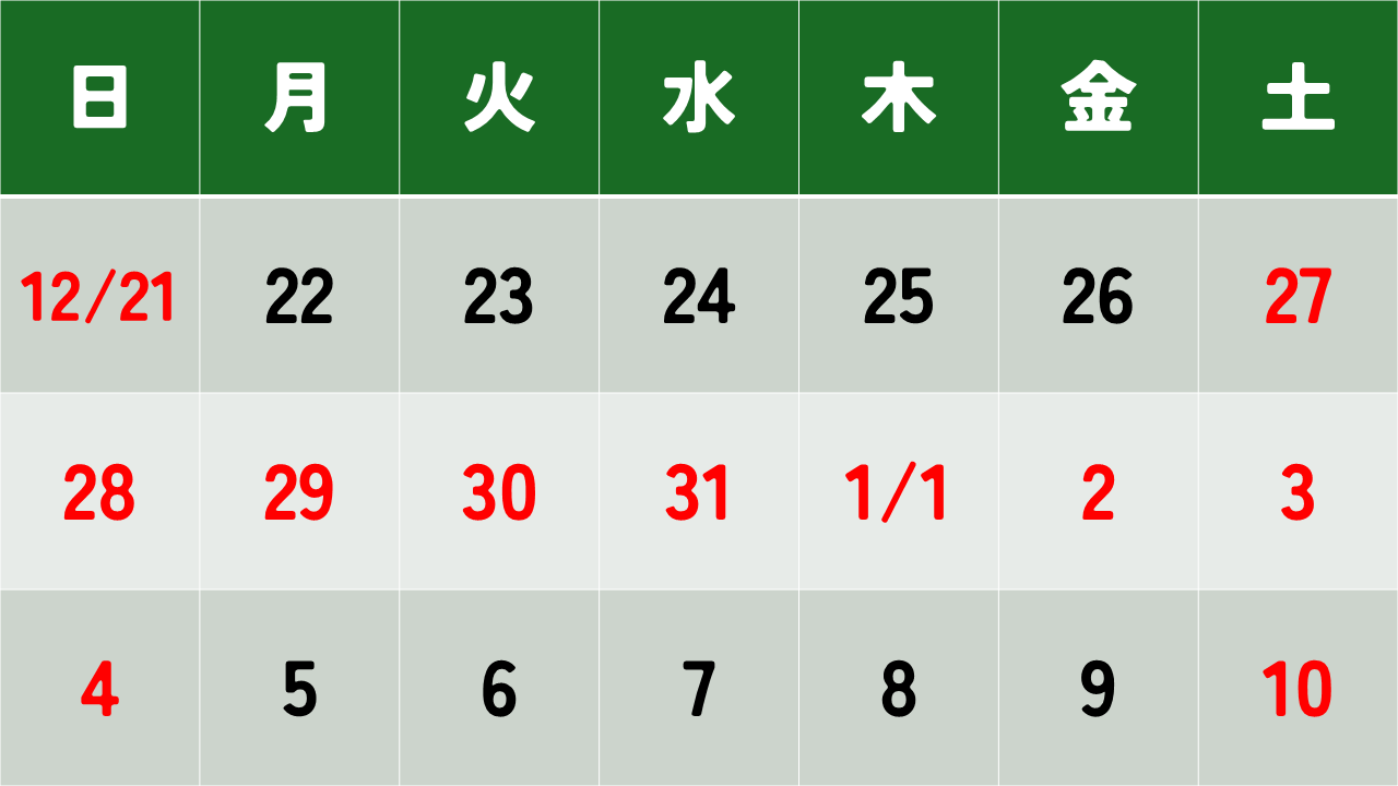 12月28日(木) 〜 翌年1月3日(水)まで休みとさせていただきます。